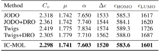 在QM9数据集上,针对六种量子属性(如热容、偶极矩等)模拟了两种分布偏移场景(从小值域到大值域S→L,以及从大值域到小值域L→S),并与JODO、Twigs等当前最先进的方法及其结合分布鲁棒优化(DRO)的变体进行了对比。在两种分布偏移场景下,IC-MOL在六种属性上都取得了最低的平均绝对误差,证明了其生成分子的属性更接近目标属性。