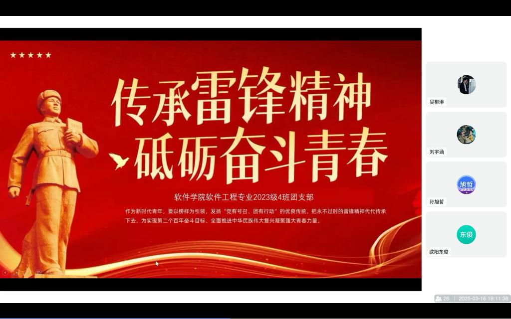 3月5日是学雷锋纪念日,团支部开展了学习雷锋精神的主题团课,团支书借助图文与视频资料,生动讲述雷锋生平事迹,从其日常助人小事到无私奉献精神的全方位展现,让团员们深刻认识雷锋。通过本次团课,团员们加深对雷锋精神的领悟,纷纷表示要将雷锋精神内化于心、外化于行,在生活中积极践行,让雷锋精神在新时代绽放新光芒 。